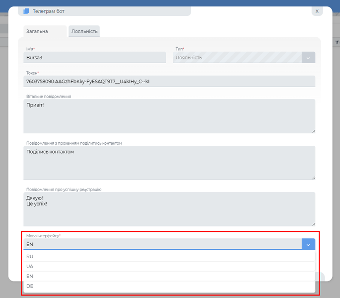 Вибір мови при створенні чат-боту. Доступні мови для вибору: Українська, Англійська, Німецька, російська