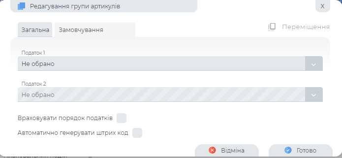Вкладка "Замовчування" при створенні або редагуванні групи артикулів