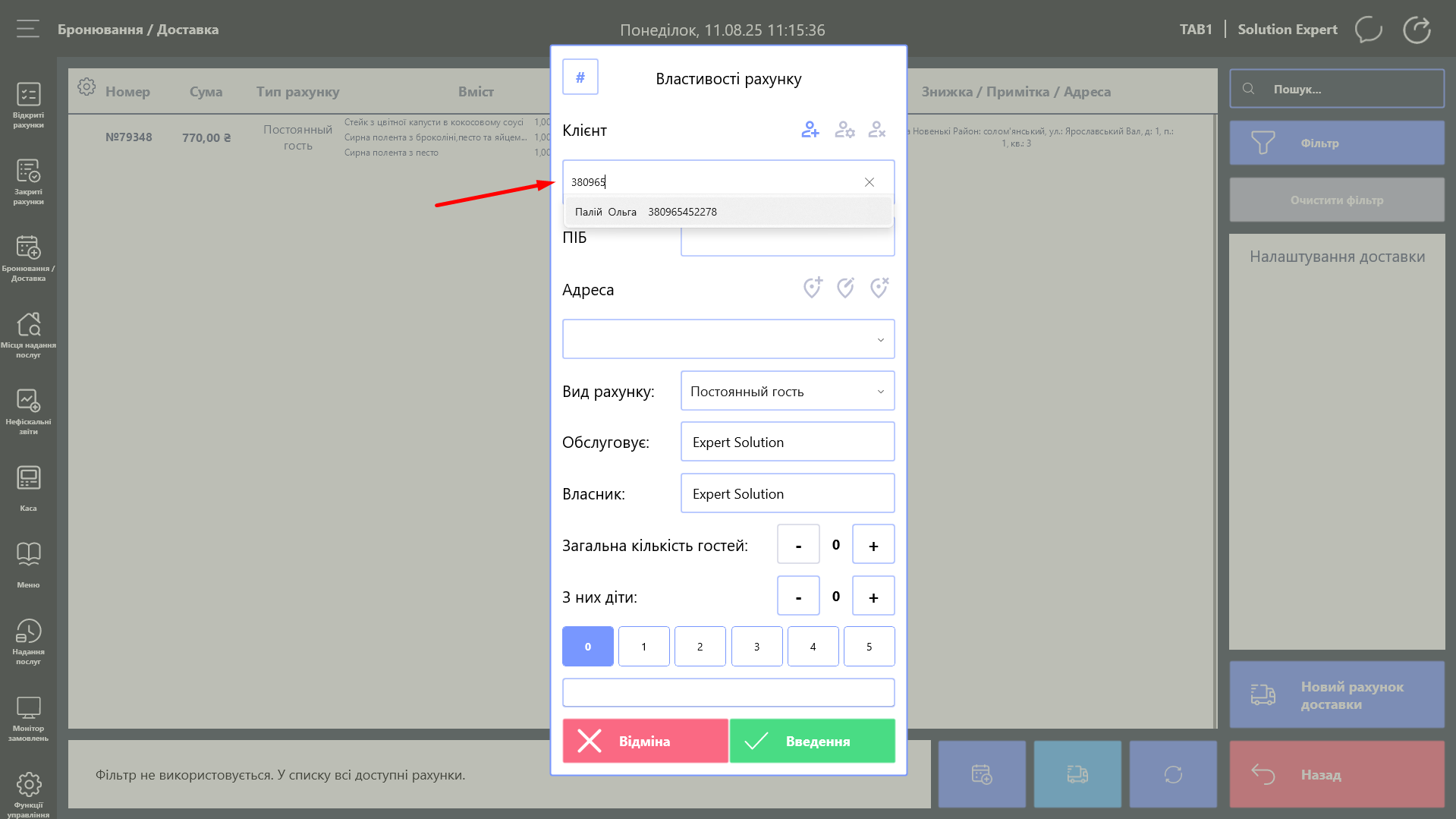 Вікно реквізитів рахунку доставки. Вводиться номер теелфону клієнта, додається потрібний клієнт і всі інші данні підтягуються автоматично
