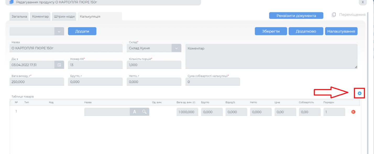 Додавання позицій в калькуляцію
