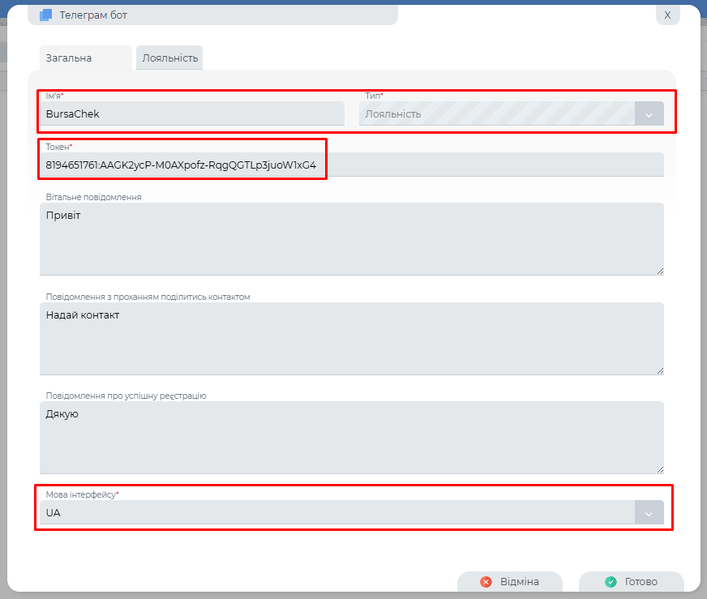 Поля: "Ім'я" - підтягується назва чат-боту автоматично "Тип" проставляються по дефолту. Токен береться у BotFather