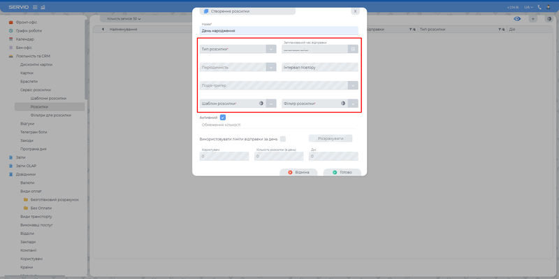 1. Назва 2. Тип розсилки (одноразова, періодична, по тригеру) 3. Запланований час відправки (при одноразуовій або періодичній розсилці окрім одного тригеру "День народження компанії" потрібно вказати час відправки) 4. Періодичність (поле стає активним якщо обрати тип розсилки "Періодична", тоді обирається період по якому має відбуватись розсилка: хвилини, години, дні, тижні, місяці) 5. Інтервал (поле стає активним якщо обрано Періодичну розсилку та обрано певну періодичність, лише тоді потрібно вказати сам інтервал) 6. Подія тригер (поле стає активне, якщо обрано тип розсилки По тригеру) 7. Шаблон розсилки (вкзується стоврений попередньо шаблон) 8. Фільтр розсилки (вказується попередньо створений шаблон) 9. Активний (щоб сторена розсилка була робоча потрібно поставити галочку "Активний")